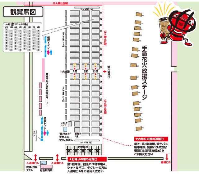 会場図 <2025.9.30更新> ■SS席 :6,000円/1席(税込)〈パイプ椅子、1~8列、手筒花火まで約31m~〉 ■S席 :5,000円/1席(税込)〈パイプ椅子、9~16列、手筒花火まで約41m~〉 ■A席 :3,500円/1席(税込)〈パイプ椅子、17~26列、手筒花火まで約51m~〉 ■カメラS席 :7,000円/1席(税込)〈パイプ椅子1脚付、幅1.2m×奥行1.5m、手筒花火まで約38m~〉 ■カメラA席 :4,000円/1席(税込)〈パイプ椅子1脚付、幅1.1m×奥行き1.5m、手筒花火まで約63m~〉 ■車椅子A席 :3,500円/1席(税込)〈フリースペース、手筒花火まで約55m、同行者も別途チケット必要 ※パイプ椅子貸出〉 |