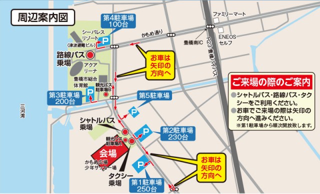 【お車でお越しの方】 <2025.9.30更新> ・会場周辺に豊橋炎の祭典来場者無料駐車場を準備いたします。駐車時は係員の指示に従い、安全に走行してください。 <第1駐車場>:会場より約150m、徒歩2分、約250台 <第2駐車場>会場より約550m、徒歩約8分、約230台 <第3駐車場>会場より約400m、徒歩約6分、約200台 <第4駐車場>会場より約750m、徒歩約10分、約100台 <第5駐車場>会場より約500m、徒歩約7分、約150台 ・第1、第2、第3・・駐車場の順に入庫案内をいたします。※第1駐車場満車後に第2駐車場解放 ・出庫時は渋滞が予想されます。予めご了承ください。