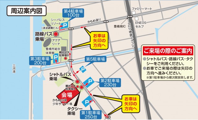 【お車でお越しの方】 <2025.10.9 更新> ・会場周辺に豊橋炎の祭典来場者無料駐車場をご用意いたします。駐車時は係員の指示に従い、安全に走行してください。 ・第1駐車場は13:30に開放いたします。第1駐車場が満車になり次第、第2、第3、第4、第5駐車場の順に解放いたします。※10月16日 第1駐車場解放時間を13:30に変更しました。 <第1駐車場>:会場より約150m、徒歩2分、約250台 <第2駐車場>会場より約550m、徒歩約8分、約230台 <第3駐車場>会場より約400m、徒歩約6分、約200台 <第4駐車場>会場より約750m、徒歩約10分、約100台 <第5駐車場>会場より約500m、徒歩約7分、約150台 ・出庫時は渋滞が予想されます。予めご了承ください。